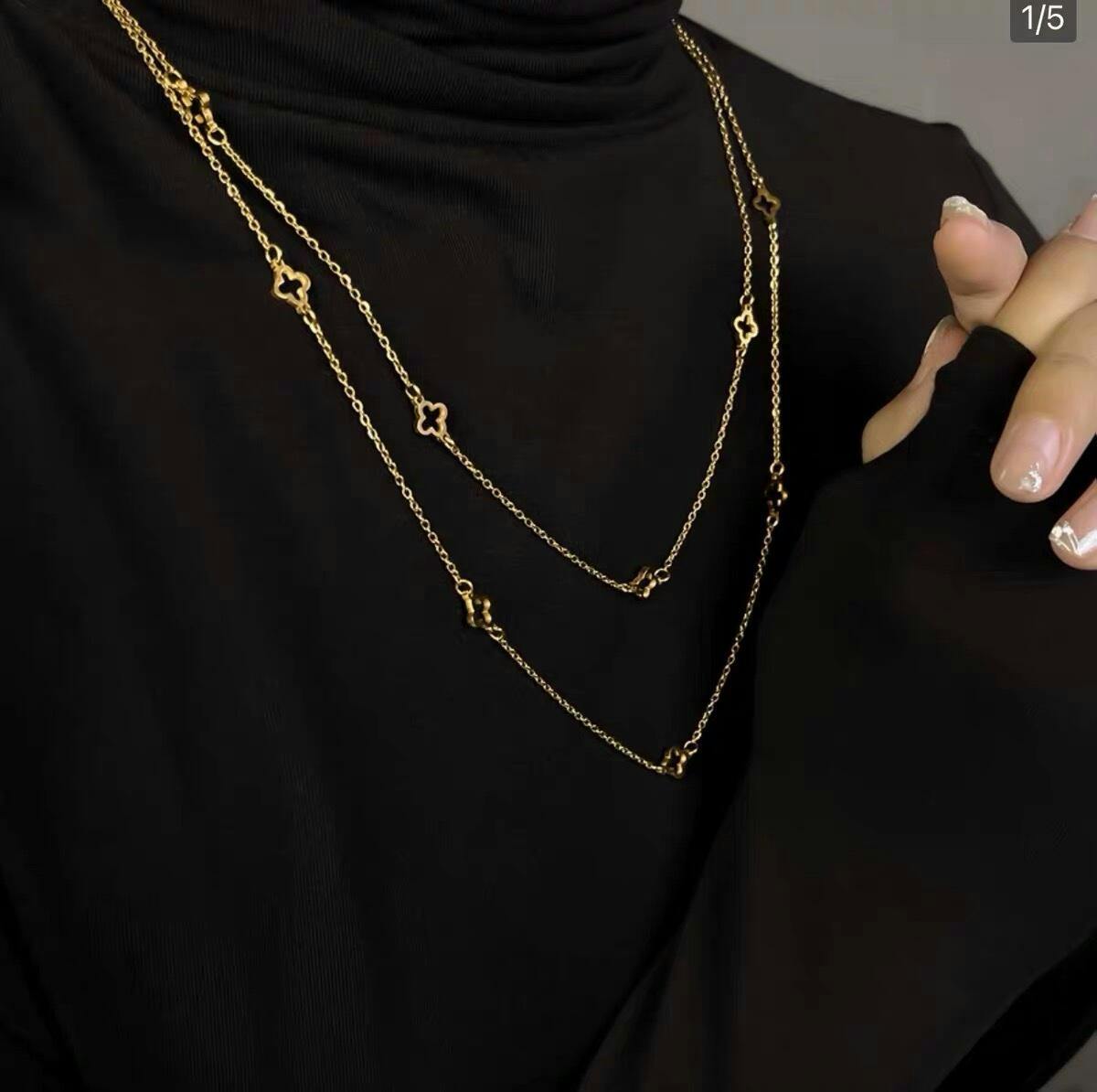 Necklace: Features multiple spaced clover charms along a delicate chain